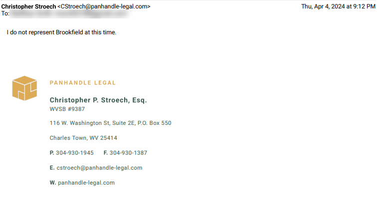 Did you know Brookfield’s Attorney for the last 5 years- Chris Stroech, Panhandle Legal, terminated his contract with Brookfield?