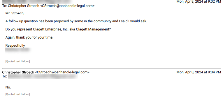 This is Mr. Stroech‘s response when asked if he represents Clagett Management.